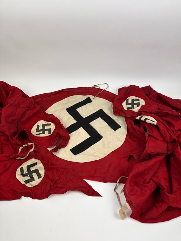 In the middle a large swastika and on the other side 6 small swastika flags.