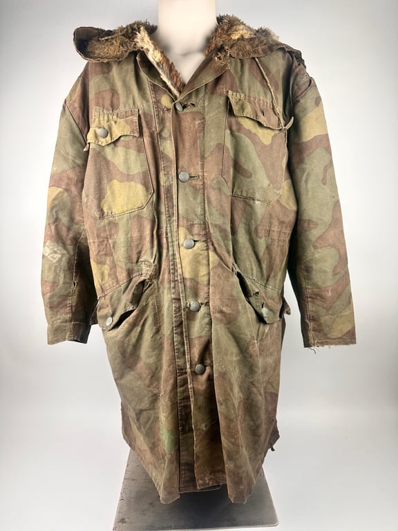 WW2 German Waffen-SS camouflage "Kharkov" parka. Worn by menbers of the Waffen-SS. The Rabbit fur lining still in it. Has some field repairs. Real Combat Used condition.